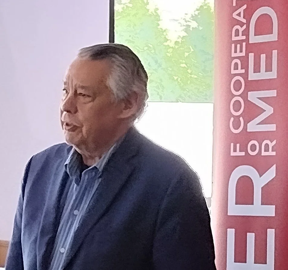 Juan Gonzalez during the May 2023 Ethnic Media gathering sponsored by the Center for Cooperative Media at Razui Restaurant in Edison, NJ.