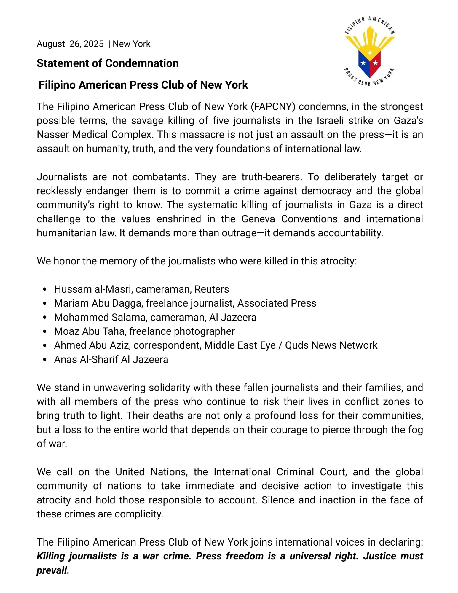 New York - The Filipino American Press Club of New York strongly condemned the killing of working journalists in Gaza. In a recent press statement, the FAPCNY said, “We condemn in the strongest possible terms the savage killing of five journalists in the Israeli strike on Gaza’s Nasser Medical Complex.”