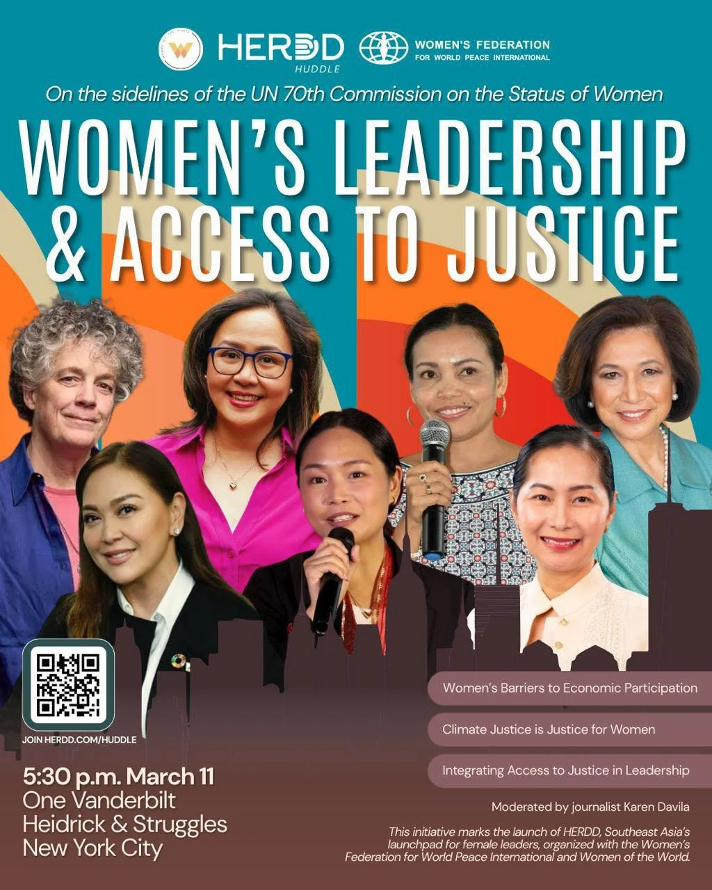 Organizing groups HERRD, Women of World (WoW) Coaching, and the Women’s Federation for World Peace International are featuring the lived experiences and expertise of Philippine Trade Commissioner for New York Alma Argayoso, Dr. Fran Johnston, Founder and CEO of Teleos Leadership Institute, Merly Barrete Barlaan, WFWPI UN Relations Offices director, Ivanna Aguiling-Dela Torre, Chief Curator of HERRD, Isa-Miguel Buencamino, founder of Women of the World Coaching, and Ms. Loida Nicolas Lewis, FilAm philanthropist and immigration attorney.