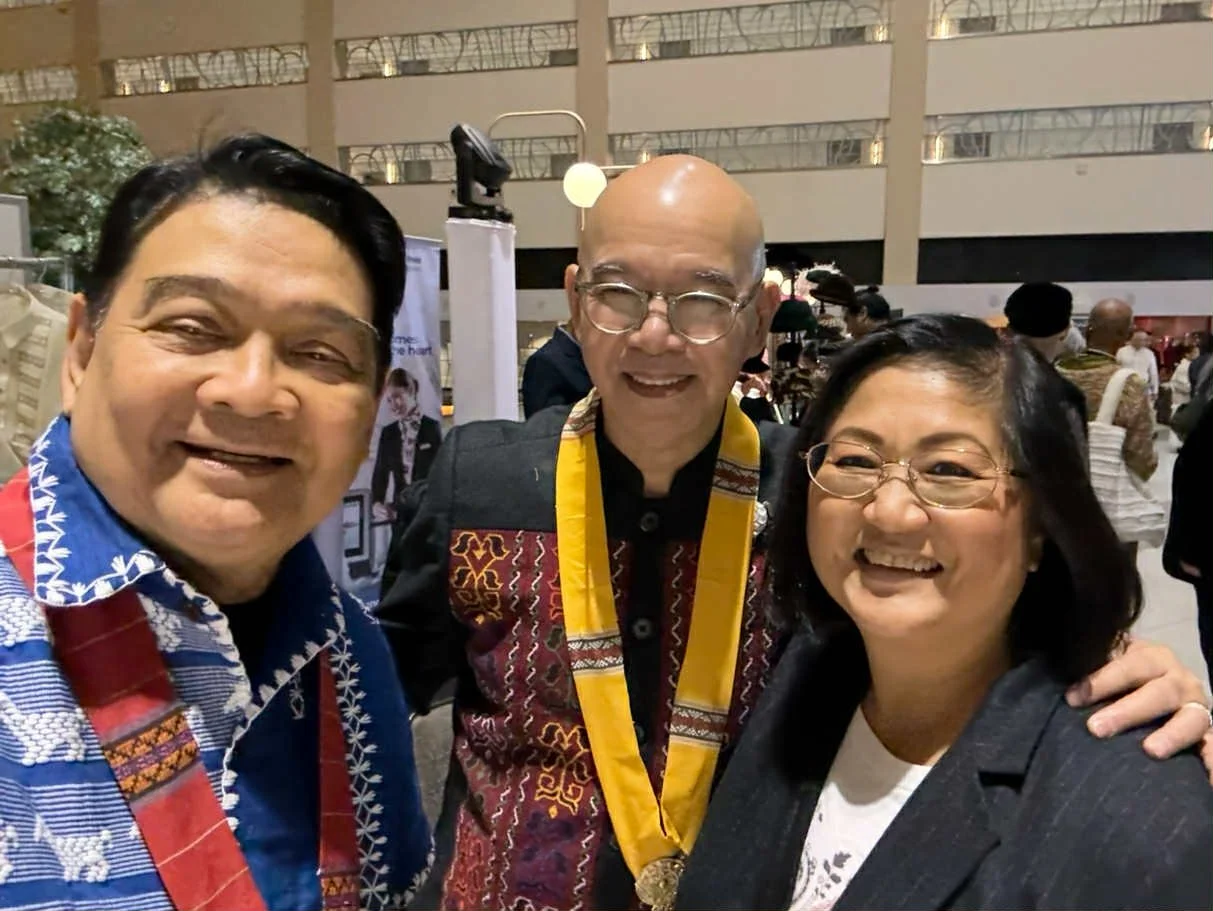 Organizers Edwin Josue (left) and Jerry Sibal (right) with Philippine Consul General in NY Senen Mangalile during the YAMAN opening. They wore exquisitely woven and embroidered Philippine suits.